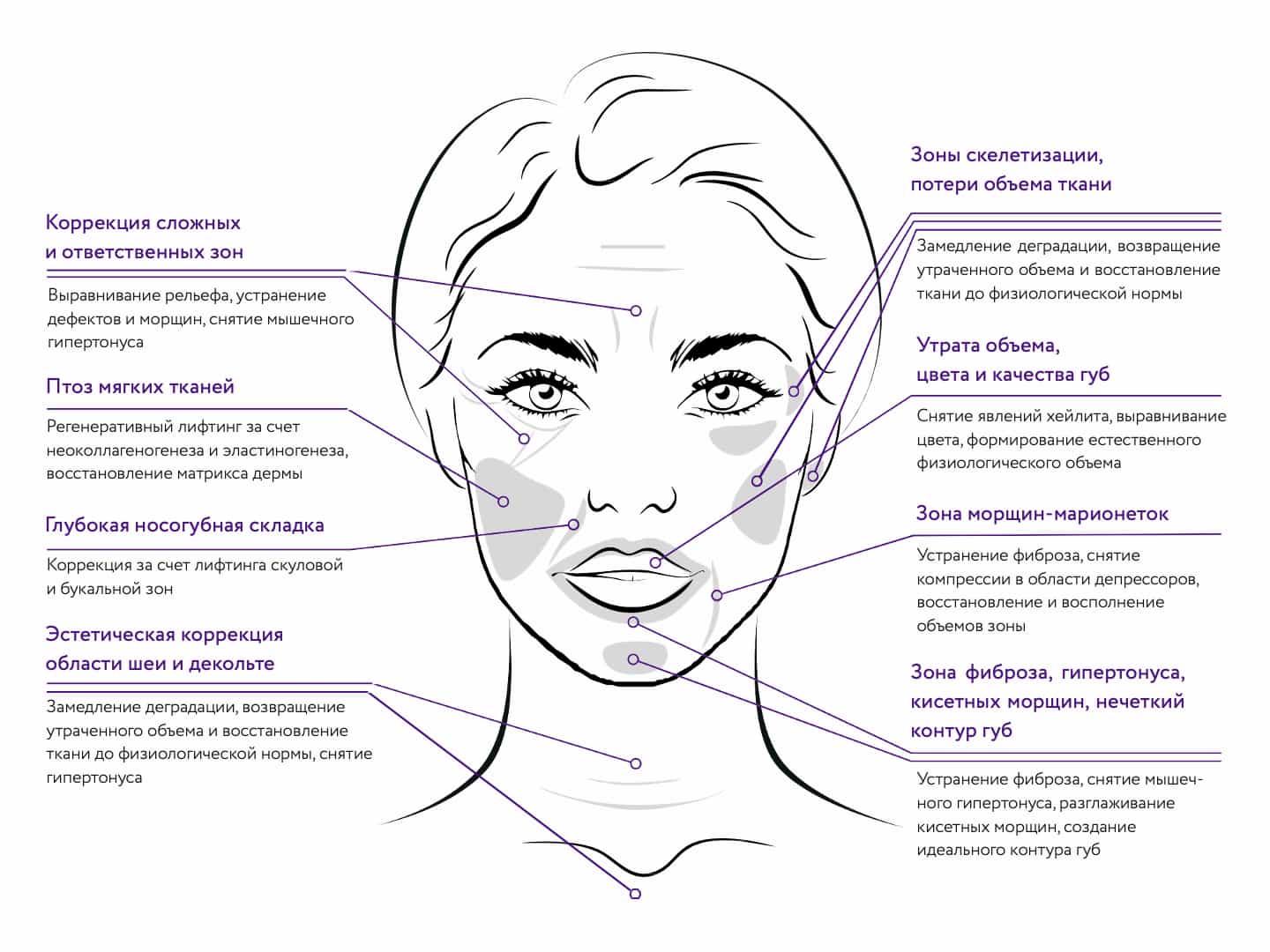 Фото- и хроностарение, снижение тургора, дряблость кожи. Проявленная возрастная атрофия кожи, потеря объема тканей, дефицит матрикса кожи. Глубокие дермальные морщины, особенно в зонах компрессии (периоральная зона). Зоны скелетизации, дефицита ПЖК (как альтернатива липофиллингу). Зоны неровного рельефа кожи и подкожных тканей после липосакций.
